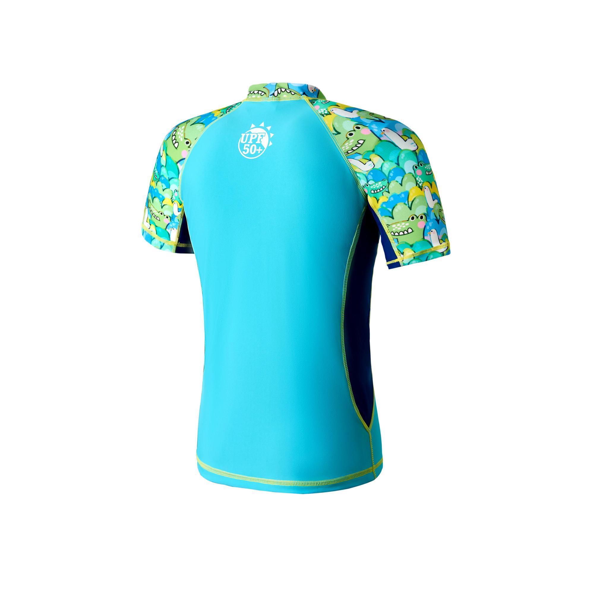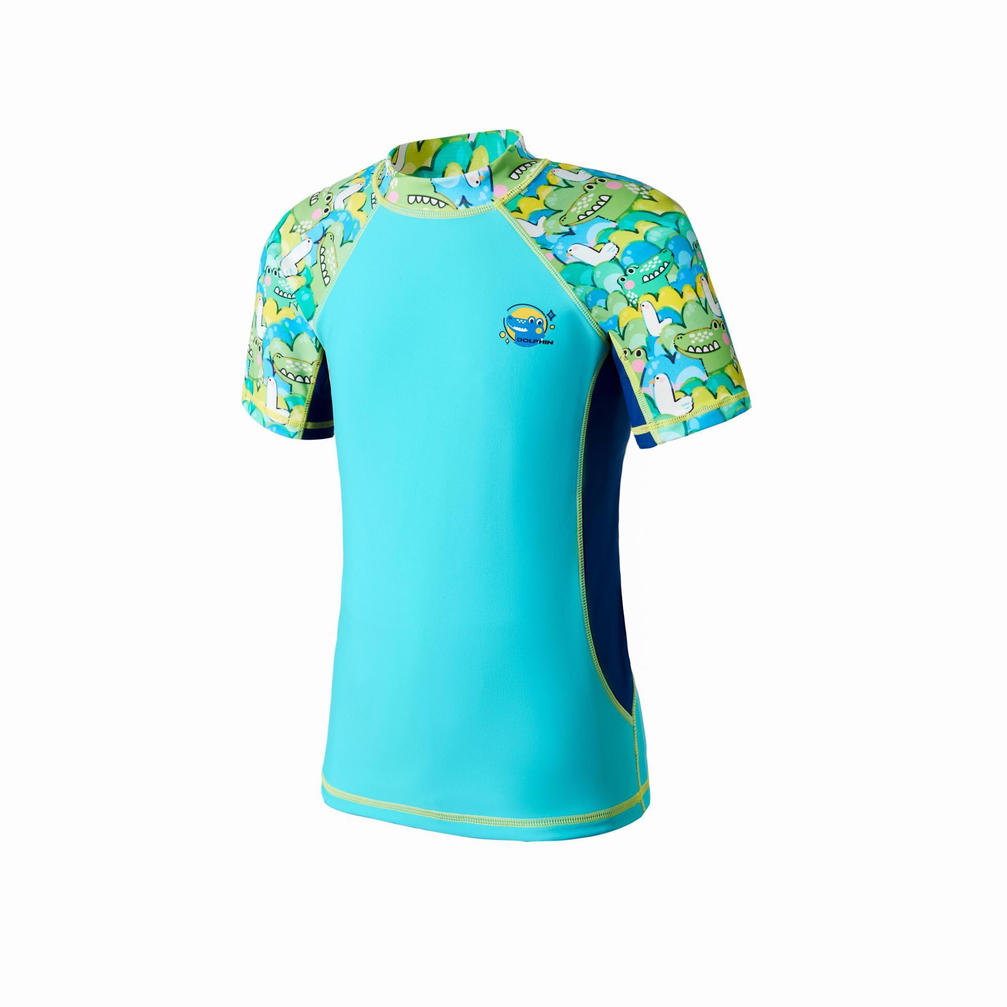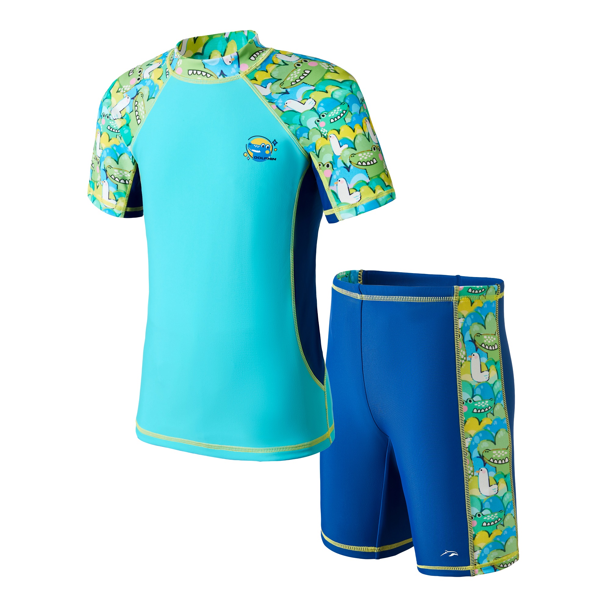 Dolphin小童游泳防曬套裝 – 鱷趣探險 是一款為喜愛水上活動的孩子量身打造的兩件式泳裝。採用趣味滿分的卡通鱷魚印花,搭配亮眼配色,讓孩子在泳池或海灘中都成為矚目小主角。 有清爽綠藍與夢幻紫粉兩種主題配色,滿足不同個性小朋友的選擇。 材質方面選用柔軟快乾布料,提供全天候舒適體驗;短袖上衣加上平口泳褲的設計,防曬之餘也方便孩子自由活動,是家長最安心的選擇!