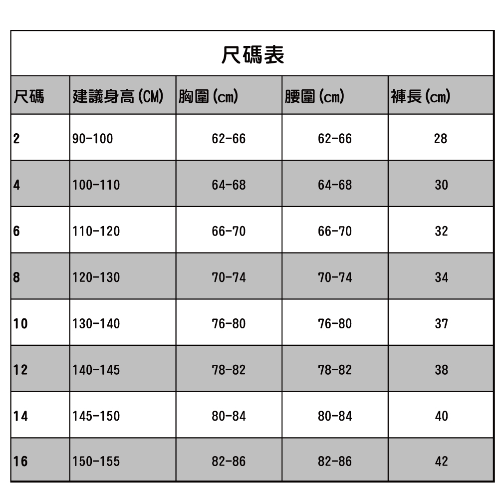 - 本網站所標示的「建議身高」僅為一般參考依據,因每人的體型差異、成長速度及個人喜好不同,實際合身度應以試穿或依照自身胸圍、腰圍、肩寬等多項數據綜合判斷後,再做最終尺寸選擇。